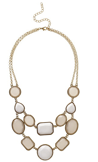 Although I’m not much for neutrals, I like this necklace because it is neutral. It offers me a nice, subtle way to try this trend and I played to that by pairing the necklace with a terra cotta-colored dress (Target) and adding other neutral accessories. I do think it will provide a nice pop in an all-black outfit as well.